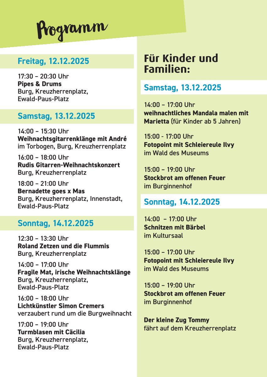Für eine weihnachtliche Stimmung im Burginnenhof sorgen verschiedene Musikgruppen und walking-acts, die abwechselnd zwischen den Marktständen und Glühweinbuden Weihnachtslieder spielen.