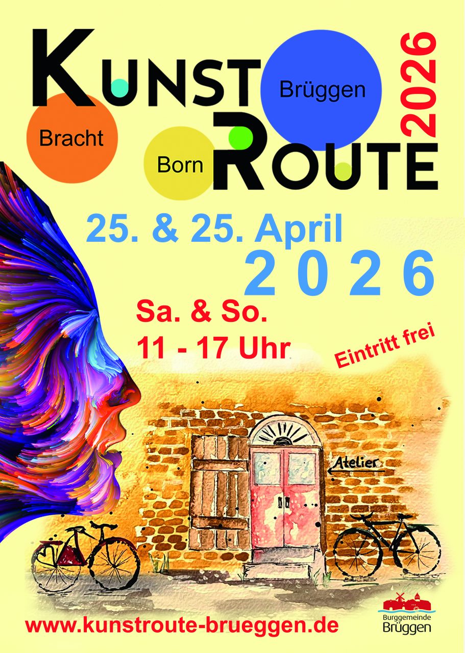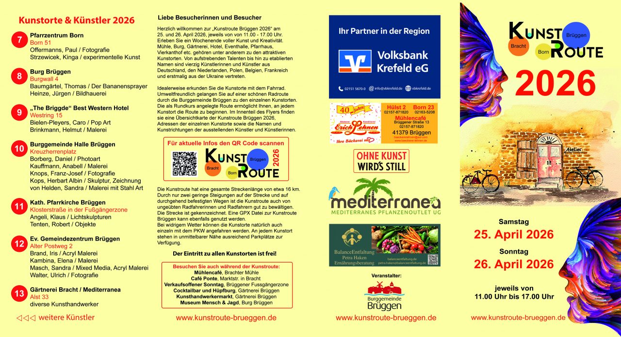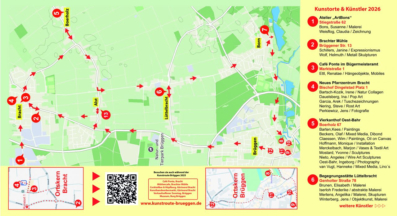 Zur Kunstroute Brüggen 2026 wird ein Flyer mit einer Übersichtkarte der Route herausgegeben. diese sind im örtlichen Handel wie auch in öffentlichen Einrichtungen der umliegenden Gemeinden erhältlich. Im Flyer findest du neben einer Übersichtskarte die Adressen der einzelnen Kunstorte sowie die Namen und Kunstrichtungen der ausstellenden Kunstschaffenden.