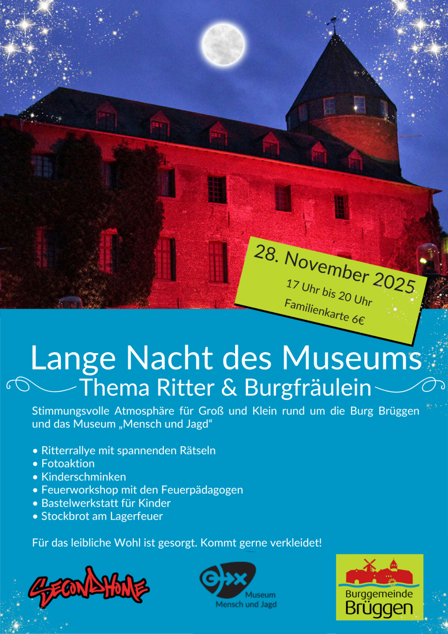 Eine märchenhafte Veranstaltung erwartet Familien am Freitag, den 28.11.2025 in der Zeit von 17.00 bis 20.00 Uhr in der Burg Brüggen. Bei der diesjährigen „Langen Museumsnacht“ dreht sich alles rund um das Thema „Burgfräulein und Ritter“. Kinder können eine Ritterrallye mit spannenden Rätseln machen, sich schminken lassen, am Feuerworkshop mit den Feuerpädagogen teilnehmen, in der Bastelwerkstatt Ritter- und Burgfräuleindinge herstellen, eine Fotoaktion starten oder Stockbrot am Langerfeuer backen und – nicht zu vergessen – einen Drachen erlegen.